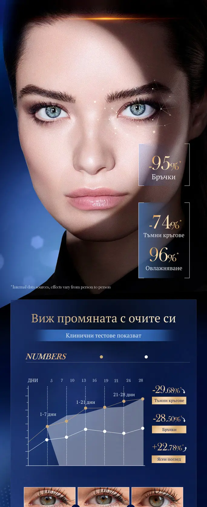 Още след първата употреба подпухналостта намалява и кожата изглежда по-свежа. В рамките на 1–2 седмици – по-гладки линии и по-равномерен тен.